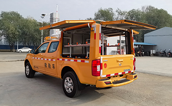 皮卡式自來水管道工程應急搶險搶修車:為適應自來水管網管道應急搶修作業的需要,針對搶修作業工具的存放需要及工作特點,本公司研制出新皮卡式應急搶險搶修專用車:皮卡式帶壓堵漏現場應急搶險搶修車。符合外出搶修工具的存放,且外出速度快,效率高,可稱為“搶修110”。