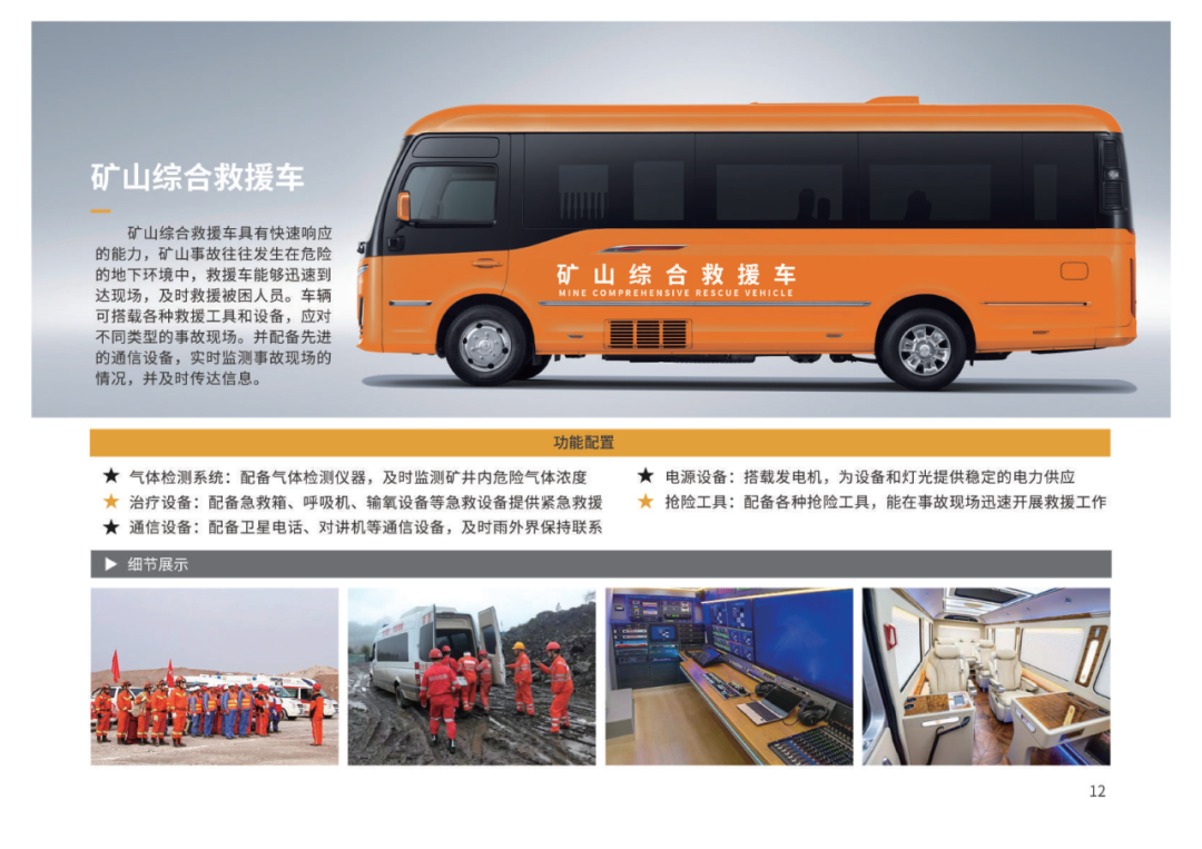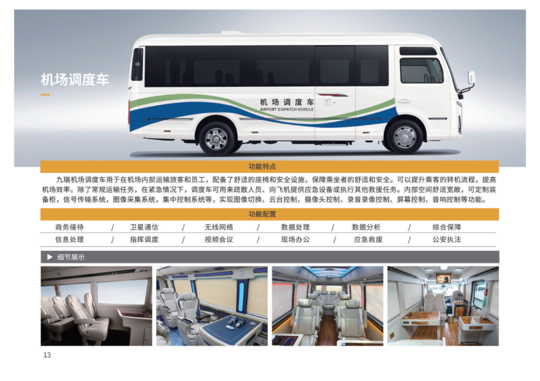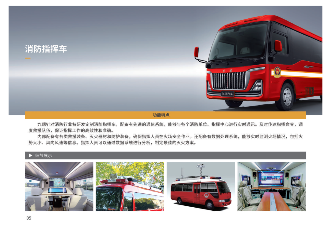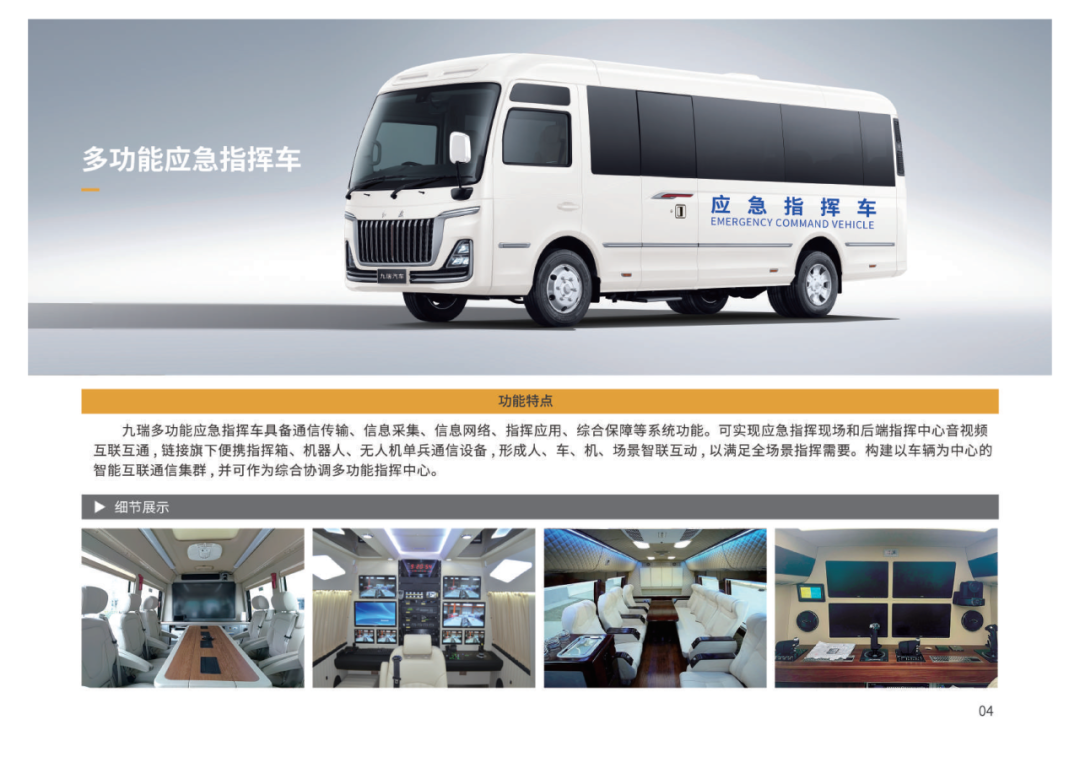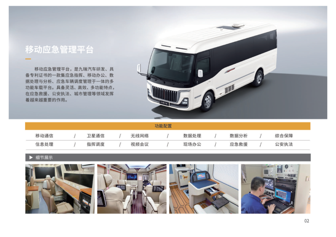 一汽紅旗與九瑞汽車強強聯合、雙向賦能,共同打造汽車生產廠商與應急裝備制造企業優勢互補、聯合創新的合作典范。 ·多功能指揮車 ·消防指揮車 ·移動衛星基站車 ·衛星通信車 ·移動應急管理平臺 ·公安指揮車 ·無人機巡檢車 ·氣象監測車 ·無人機反制車 ·危險氣體檢測車 ·礦山綜合救援車 ·商務車 ·健康體檢車 ·宿營車 ·機場調度車 ·醫療車