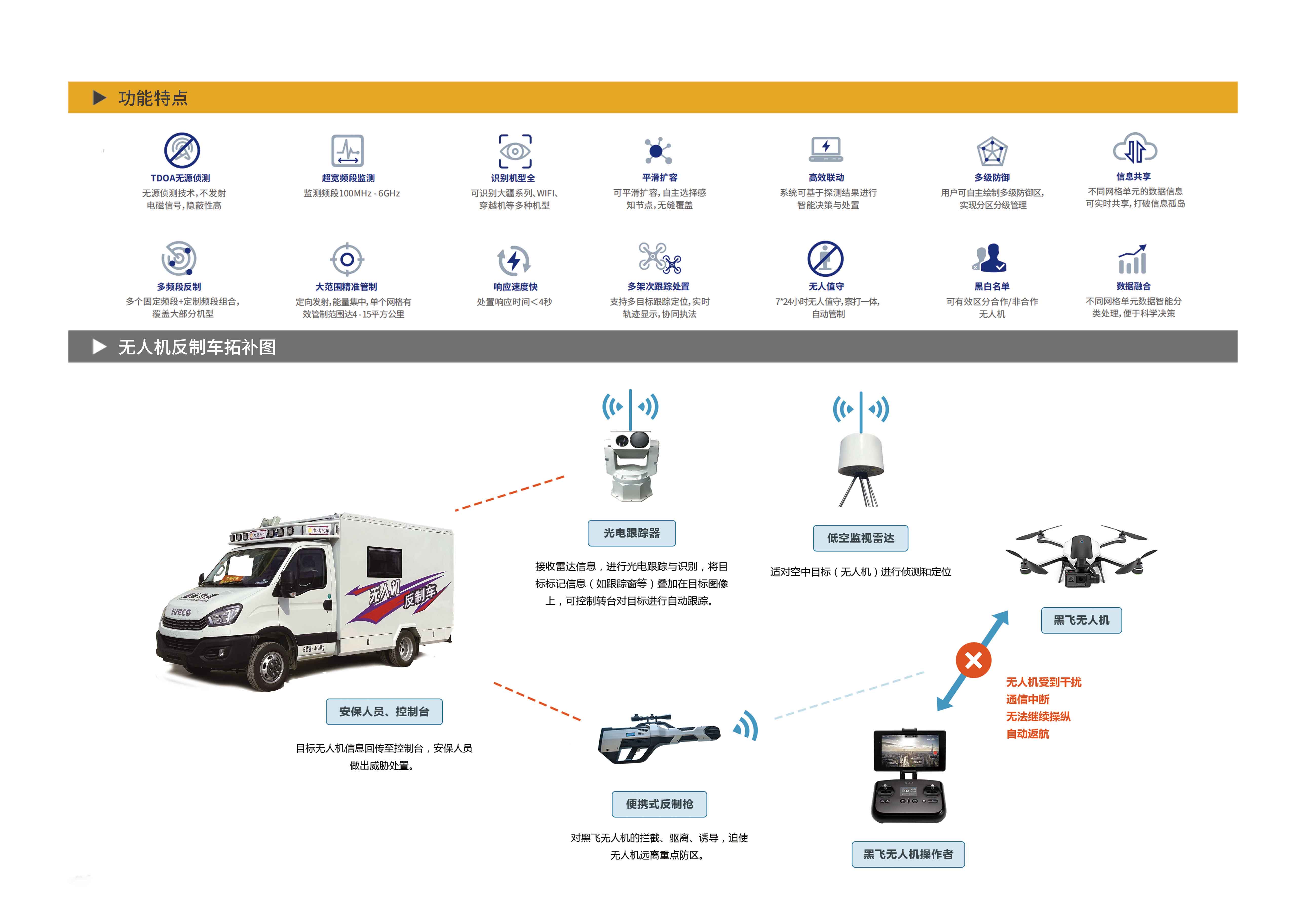 反制相關設備:搭配特金低空安全管理平臺。低空安全管理平臺是面向城市級大面積空域低空安全管理需求而開發設計的智能化軟件平臺,它深度融合了人工智能、大數據等前沿技術,構筑起“探測、預警、個體識別、實時定位、軌跡追蹤、精準處置、數據分析”六位一體的端到端低空安全管理能力。該平臺 采用開放式架構,具備強大的多源設備接入能力,可接入頻譜、5G-A、光電、雷達、無線電壓制、導航誘騙等各類固定式低空安全管控設備,以及手持式、車載式設備,形成立體化空地一體監測網絡,有效滿足合作與非合作目標的安全管理需求,為城市低空提供全方位安全管控能力。