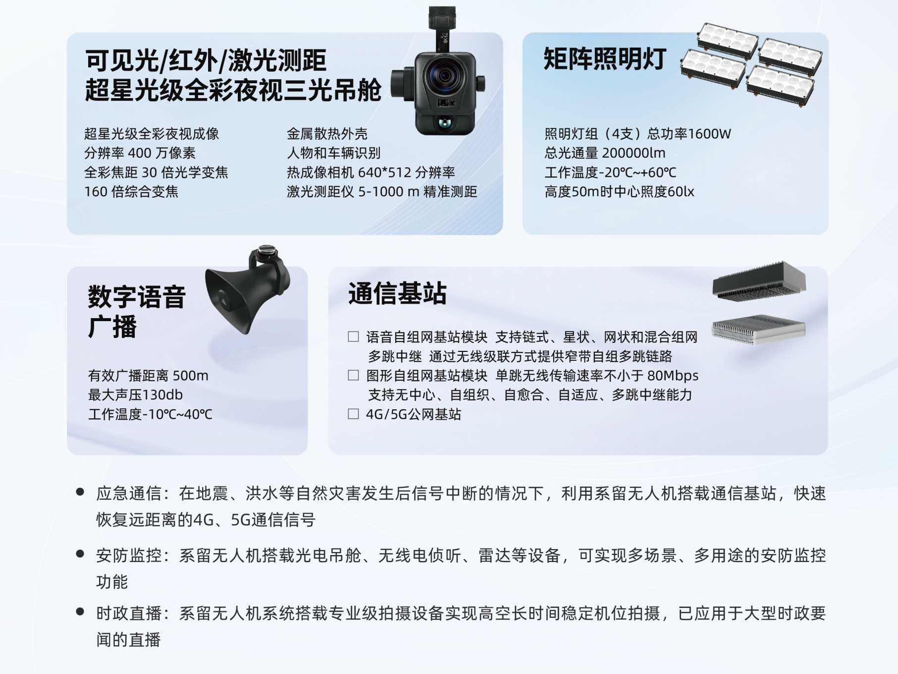 系留無人機:24H超長不間斷滯空、抗風(fēng)6級、抗電磁干擾、10KW超低功耗、工作海拔4500米、多冗余度飛控系統(tǒng)確保飛行安全;